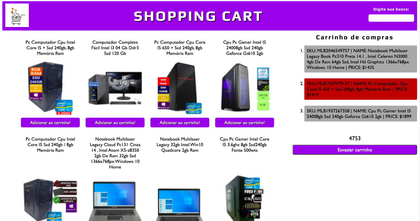 Simple e-commerce clone with shopping cart functionality based on the MercadoLivre API, built with React.